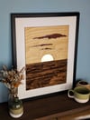 Sunset over Ynyslas Beach, woodcut artwork